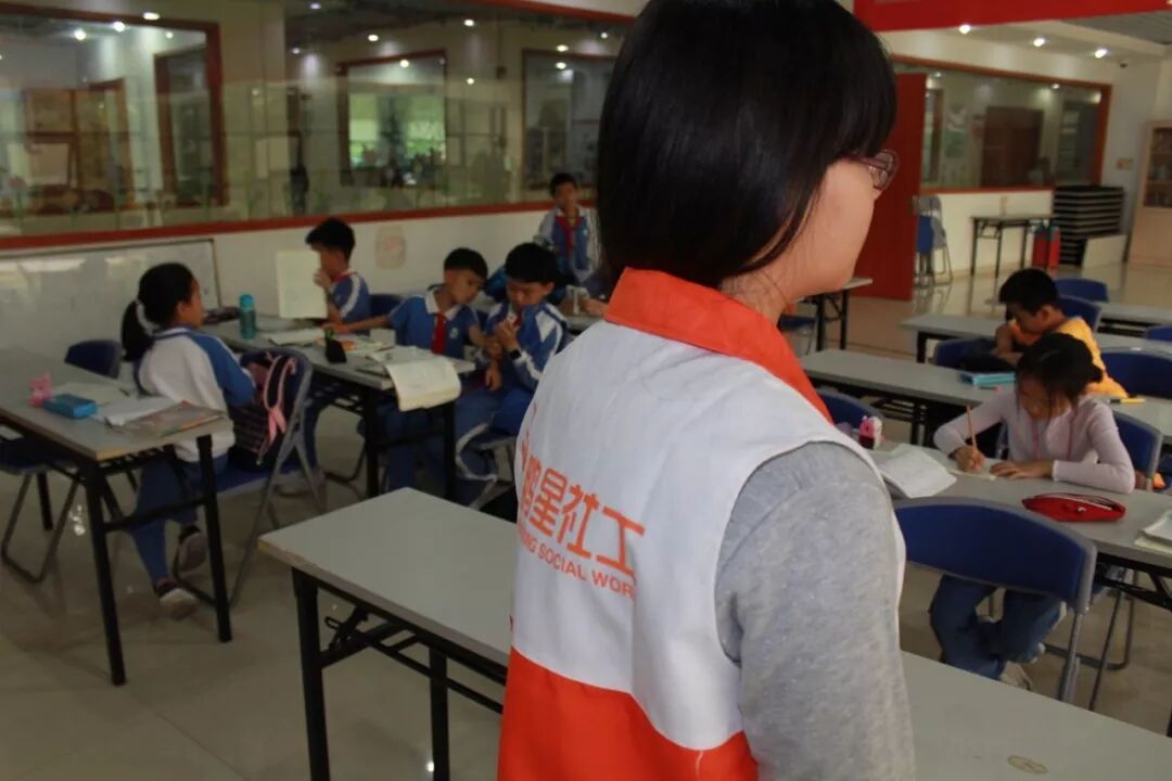 “老师,这道题我不会”,四点半课堂上,学员正举着手向社工或值班义工寻求课业辅导。