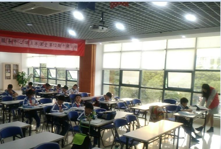 “嘘~小点声哦,不要打扰到其他同学写作业”四点半课堂的志愿义工也在一旁低声的提醒着学员保持课堂安静,维持课堂上的纪律。