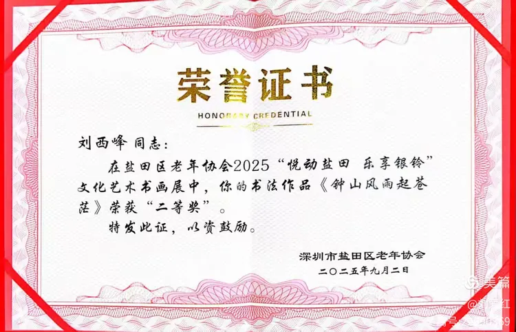2025年10月15日,倚山老年人协会再添喜讯,在“悦动盐田 乐享银铃”活动中,协会成员刘西峰凭借书法作品《钟山风雨起苍茫》脱颖而出,成功斩获二等奖,为倚山老协赢得荣誉的同时,也展现了老年群体老有所学、老有所为的精神风貌。