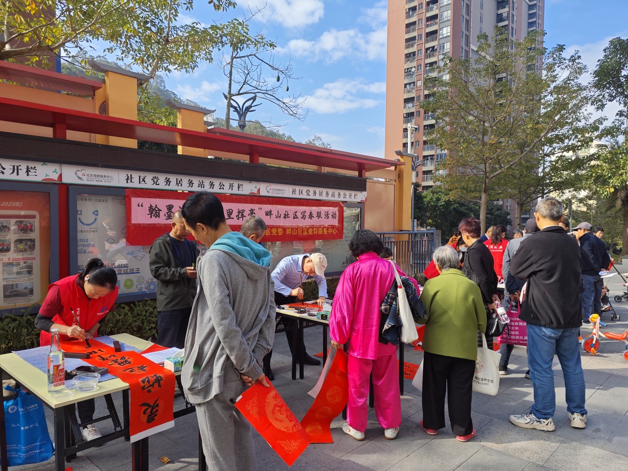 岁末寒浓,年味渐浓。为传承中华优秀传统文化,营造喜庆祥和的新春氛围,拉近邻里情谊,2月4日上午,畔山社区党群服务中心开展“翰墨迎春・邻里挥毫”春节写春联活动,深圳市北斗社会工作服务中心社工发掘并邀请5位社区书法爱好者现场挥毫泼墨,以笔墨传祝福,以春联聚人心,让居民在墨香氤氲中感受传统年俗的独特魅力。
