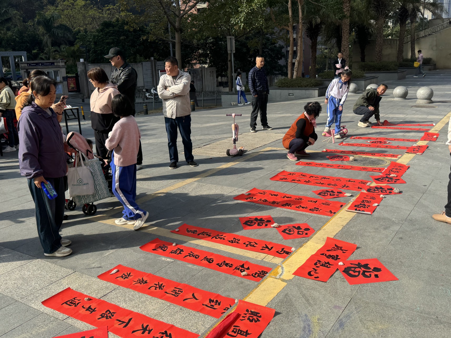 居民们热情高涨,或围在案前静静观赏,感受书法艺术的博大精深;或与书法爱好者交流自己心仪的联句,现场不时响起阵阵称赞声。不少居民主动“点单”,请书法爱好者定制专属春联,孩子们则好奇地围观笔墨舞动的瞬间,在潜移默化中感受汉字书法之美与传统年俗之趣。拿到墨迹未干的春联和“福”字后,大家迫不及待地展开欣赏,“晒福”氛围格外浓厚——有人趁着晴好将“福”字铺开晾晒,让福气伴着暖阳沉淀;更多人拿出手机拍照,把这份手写的美好分享到朋友圈,双重方式定格专属新春喜悦,现场一派热闹祥和的景象。
