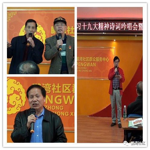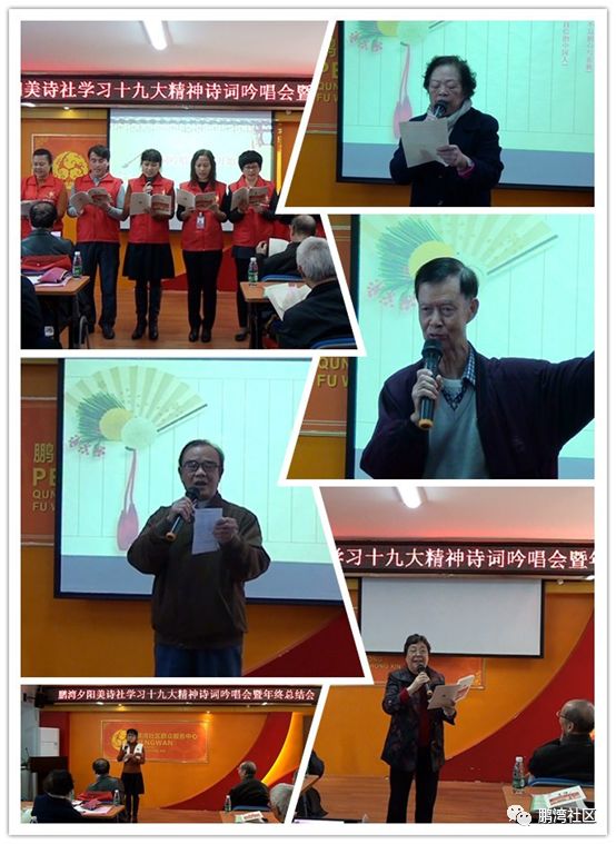 12月29日,鹏湾社区夕阳美诗社60多位诗友从四面八方赶来齐聚鹏湾将满怀喜悦和激动化作诗词和歌声,共同吟颂‘“十九大精神”,共话诗友情谊。在诗词吟唱和歌声中共同告别2017,携手迎接充满希望的2018年。海山街道党工委委员、组宣办主任滕湘丽、海山街道文化站站长张绍桉、鹏湾社区党委副书记李怡龙、谢瑞端等领导出席了本次活动。